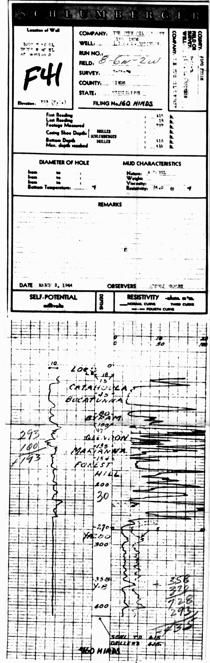 Item in the historic collection of geophysical logs housed at the Mississippi Office of Geology's Environmental Geology Division and corresponding website Electric Log 1 Inch WellID-049F0041 Owned ByPURE OIL COMPANY - #2 L. ROBINSON - HINDS#160 Drilled By PURE OIL COMPANY 6N-2W-8