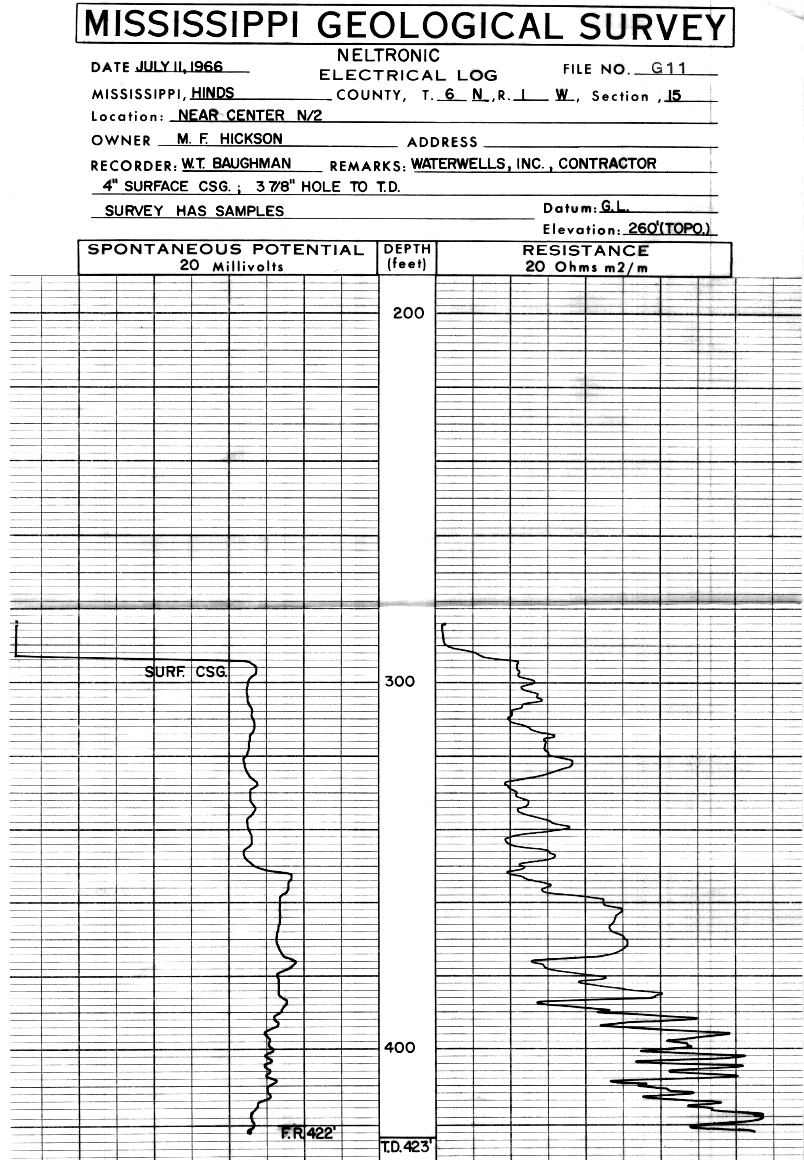 Item in the historic collection of geophysical logs housed at the Mississippi Office of Geology's Environmental Geology Division and corresponding website Electric Log 5 Inch WellID-049G0011 Owned ByM.F. HICKSON Drilled By WATERWELLS; Inc 6N-1W-15