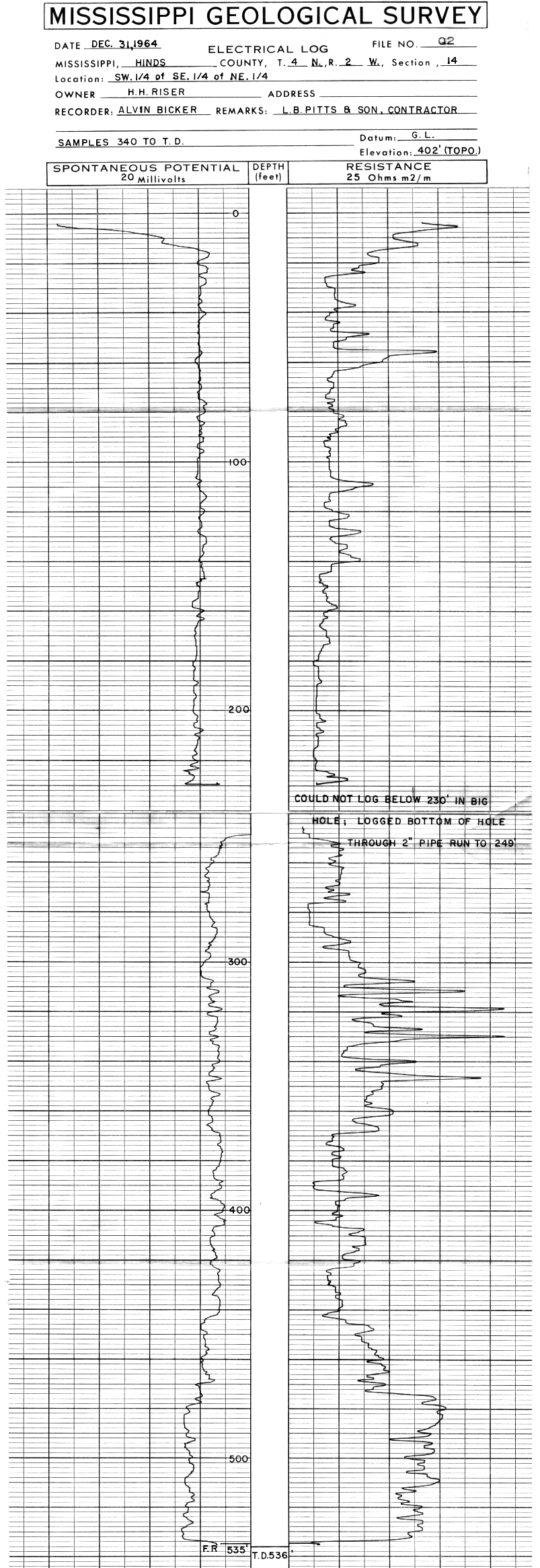 Item in the historic collection of geophysical logs housed at the Mississippi Office of Geology's Environmental Geology Division and corresponding website Electric Log 5 Inch WellID-049Q0002 Owned ByH.H. RISER Drilled By L.B. PITTS & SON 4N-2W-14