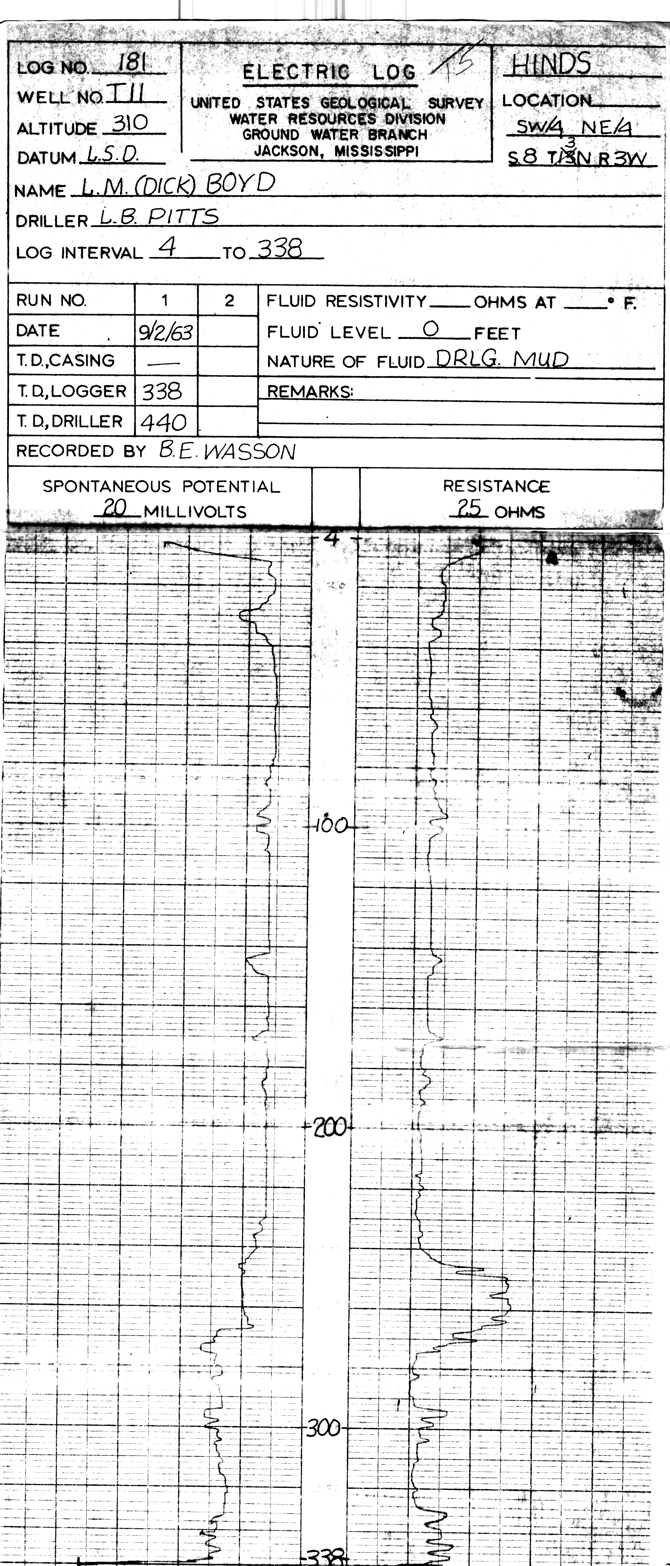 Item in the historic collection of geophysical logs housed at the Mississippi Office of Geology's Environmental Geology Division and corresponding website Electric Log 5 Inch WellID-049T0005 Owned ByL.M. (DICK) BOYD Drilled By L.B. PITTS 3N-3W-8