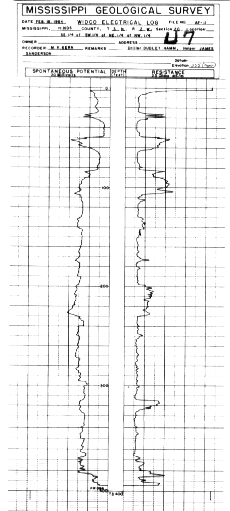 Item in the historic collection of geophysical logs housed at the Mississippi Office of Geology's Environmental Geology Division and corresponding website Electric Log 1 Inch WellID-049U0007 Owned ByMISSISSIPPI GEOLOGICAL SURVEY - Th# AF-11 Drilled By MISSISSIPPI GEOLOGICAL SURVEY 3N-2W-20
