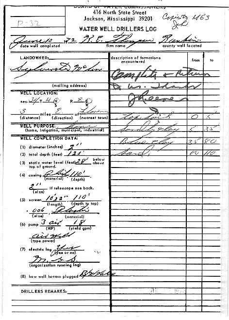 Item in the historic collection of geophysical logs housed at the Mississippi Office of Geology's Environmental Geology Division and corresponding website Drillers Log WellID-121P0032 Owned ByMASTER McLIN Drilled By K.E. THOMPSON 4N-2E-35