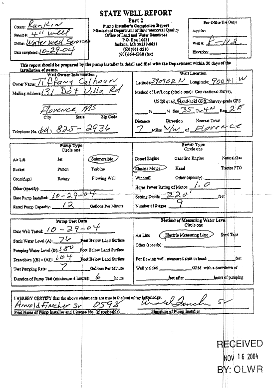 Item in the historic collection of geophysical logs housed at the Mississippi Office of Geology's Environmental Geology Division and corresponding website Drillers Log WellID-121P0112 Owned ByTIFFANY CALHOUN Drilled By WATER WELL SERVICES 4N-2E-35