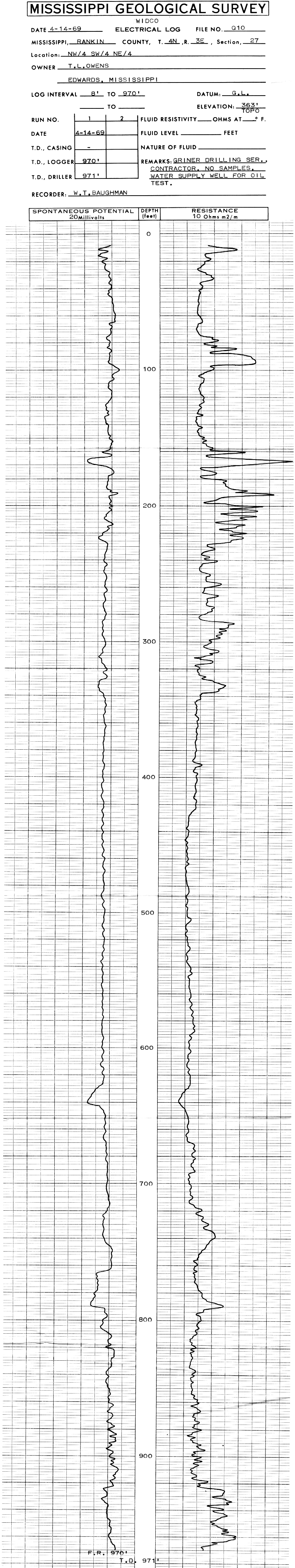 Item in the historic collection of geophysical logs housed at the Mississippi Office of Geology's Environmental Geology Division and corresponding website Electric Log 5 Inch WellID-121Q0010 Owned ByT.L. OWENS Drilled By GRINER DRILLING SERVICE 4N-3E-27