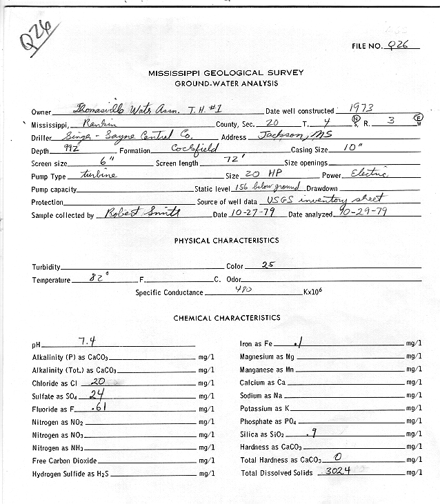 Item in the historic collection of geophysical logs housed at the Mississippi Office of Geology's Environmental Geology Division and corresponding website Chemical Test WellID-121Q0026 Owned ByTHOMASVILLE WATER ASSOCIATION Th#1 Drilled By SINGER-LAYNE CENTRAL - JACKSON OFFICE 4N-3E-20