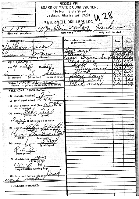 Item in the historic collection of geophysical logs housed at the Mississippi Office of Geology's Environmental Geology Division and corresponding website Drillers Log WellID-121U0028 Owned ByWILLIAM JONES Drilled By JACK D. GUINN 3N-2E-4